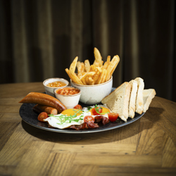 Engelsk FrukostStekt korv, stekt ägg, bacon, plommontomat, bönor i tomatsås... 169,- |