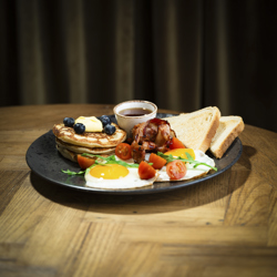 Amerikansk FrukostPannkakor, stekt ägg, bacon, plommontomat, ruccola, blåbär, ... 175,- |