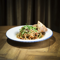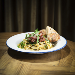 Pasta Carbonaramed ruccola, bacon och svamp. 187,- |