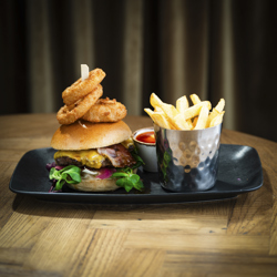 Cheeseburgare med baconEgons hamburgerdressing, grönsallad, tomat, rödlök och mi... 219,- |