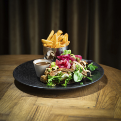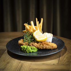 Fish & ChipsÄrtpuré, remouladsås och citron 242,- |