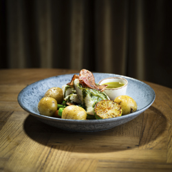 Torsk från Nord-NorgeUgnsstekt med vitlökssmör. Serveras med bacon, stekta friska... 322,- |